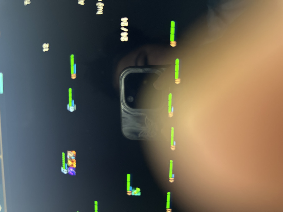 close-up of a computer screen. The screen is displaying a game, possibly a strategy game. The screen is dark, but the game elements are bright green, blue, and yellow. In the foreground, a smartphone is reflected in the screen. The smartphone is facing the camera, and the screen of the smartphone is showing the reflection of the person taking the picture. The person's hand is also visible in the foreground, partly obscuring the image. The image was taken in Vũng Tàu, Vietnam, at the coordinates 10.366, 107.1.