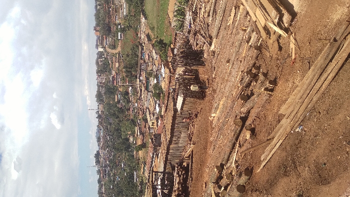 The image depicts a hillside timber yard or sawmill operation overlooking a built-up area of Nyeri, Kenya, under a partially cloudy sky