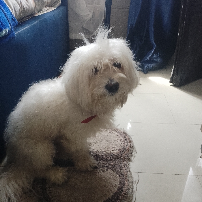 - "A small, white, long-haired dog, consistent with a Maltese or similar breed, is seated upright on a textured, shaggy rug" by FM-uPNxl1, licensed under CC BY 4.0