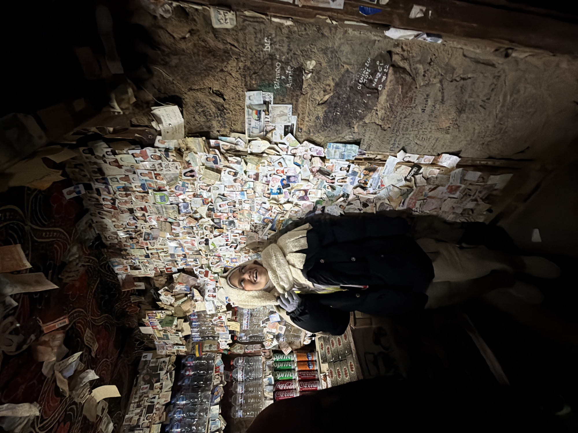 A young woman lies among an overwhelming collection of photos, bills, and inscriptions covering the walls of a small, dimly lit space, likely the Al Nabi Saleh Mausoleum in Egypt. The woman is smiling and wearing a dark winter coat and a light-colored scarf and hat. Beneath her, stacks of water bottles and soda cans are visible. The walls are covered with graffiti. The setting appears cramped and densely packed with miscellaneous items and mementos.