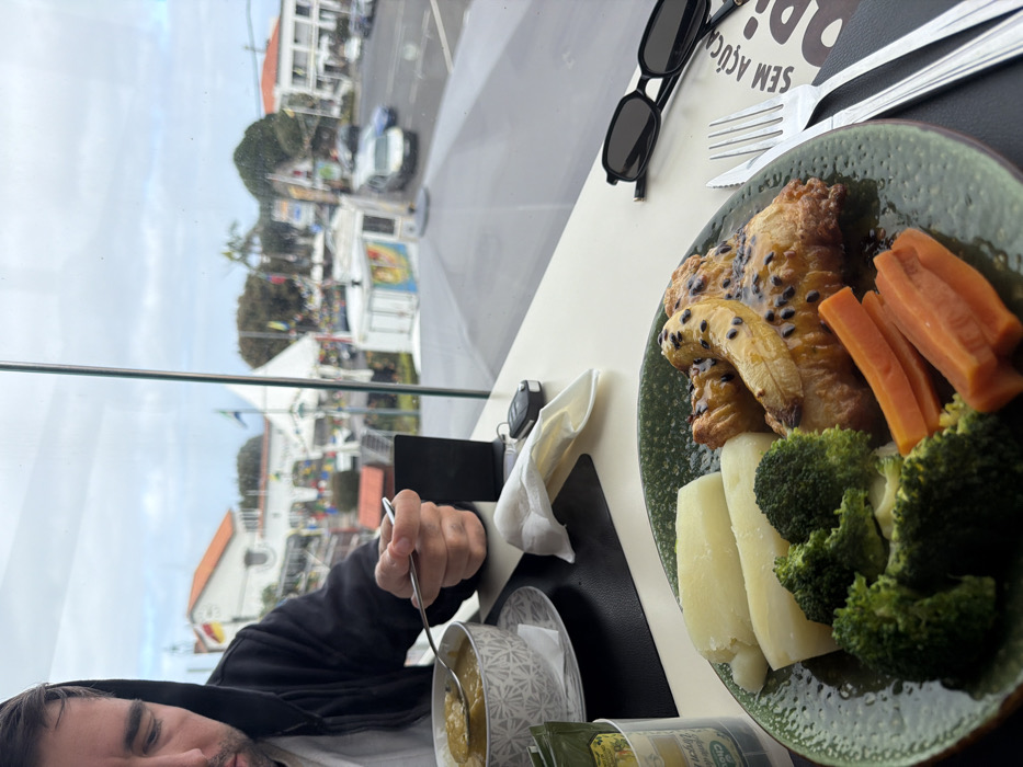 A plate of food contains meat with passion fruit sauce, carrots, cassava, and broccoli. A man wearing a black hoodie is visible, holding a spoon near a bowl with an opaque liquid. Sunglasses, silverware, a car key, and a napkin are placed on the table near the plate. A window reflects an outdoor scene featuring buildings and a street.