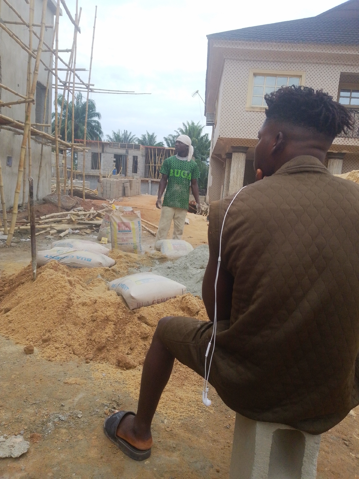 The image depicts a construction site in Alor, Nigeria. In the foreground, a man sits on a concrete block, wearing a dark brown quilted vest and shorts, with earphones hanging from his neck. He faces away from the camera. To his left is a pile of sand. In the midground, another man stands wearing a green "BUGA" t-shirt and white pants, a white cloth wrapped around his head. Behind him are sacks of "BUA CEMENT". The background shows unfinished buildings with bamboo scaffolding. The sky is overcast.