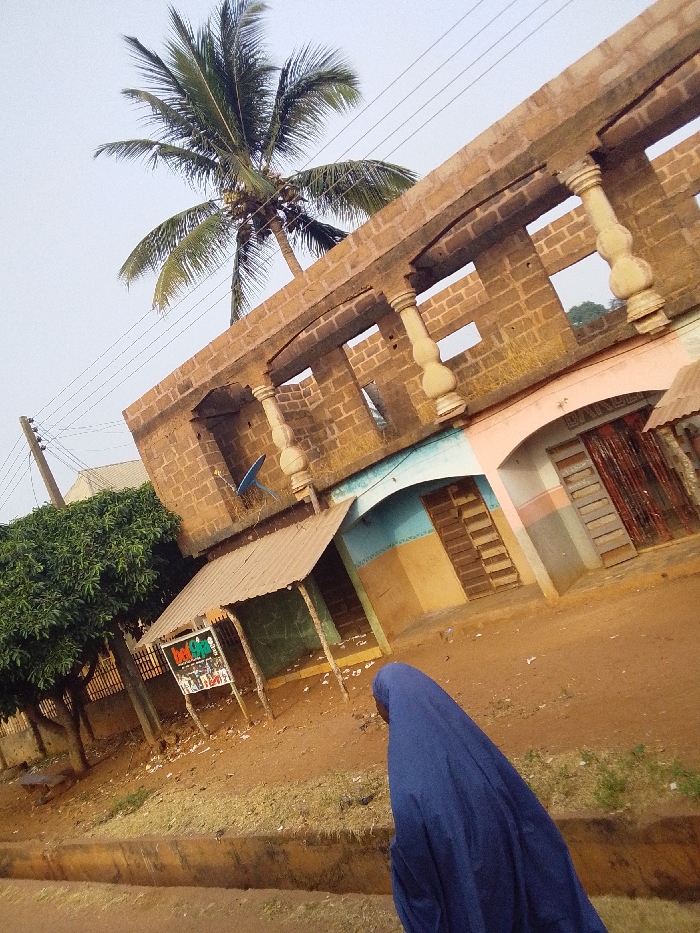 This image depicts a street scene in Emabo, Nigeria. In the immediate foreground, the back of a person wearing a dark blue, full-body garment is visible on the right. An orange-brown concrete curb delineates a reddish-brown dirt path from a dirt road. To the left, a dense green tree stands behind the curb, adjacent to a wooden utility pole supporting multiple power lines that extend across the sky. Ahead of the tree, a rudimentary vendor stall with a corrugated metal roof and wooden supports stands on the dirt path. A multi-colored sign, partially legible with text including "Deal Kids," is attached to the stall's front. Dominating the midground is a two-story building constructed from brown brick or block, appearing to be unfinished or in a state of disrepair. The upper floor presents an open facade with five arched openings separated by light-colored decorative balusters. A small blue satellite dish is affixed to the brickwork on the building's side, below the upper level. The ground floor features at least two distinct storefronts: one with light blue and orange paint, a zigzag pattern, and a closed wooden slatted door; another to its right has faded pink and grey paint with a rusted, corrugated metal sliding door. In the background, a tall palm tree laden with coconuts rises behind the two-story building, its green fronds extending into the clear, pale sky. The overall ground surface is consistent reddish-brown dirt.