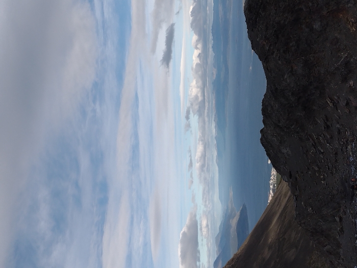 A vertical landscape reveals a sky filled with wispy clouds in shades of white and blue. Below, a body of water reflects the sky, with distant land barely visible. A sharp, dark rock formation dominates the right side, contrasting with the lighter, sandy-colored slope leading down on the left. A small town is seen in the distance between the water and the rock.