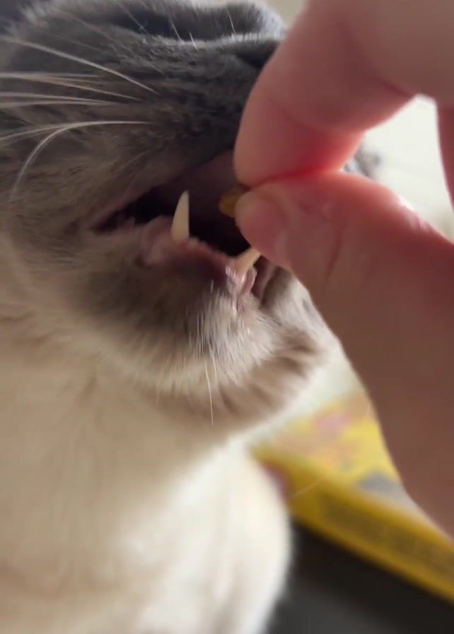 A hand holds a small, round, light brown piece of cat food or a treat in front of a gray and white cat's mouth. The hand moves closer, and the cat opens its mouth wide, revealing its teeth, including its canines. The cat then appears to eat the treat. The background is slightly blurred, but a yellow package is partially visible.