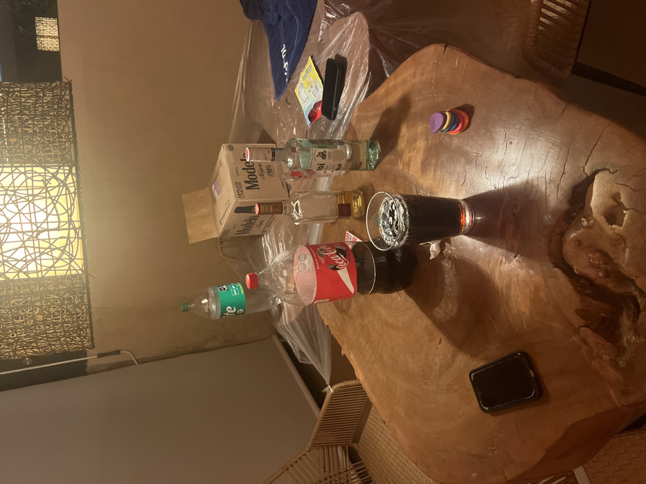 The image depicts an indoor or semi-outdoor evening scene located in El Arco, Mexico, focused on a wooden table laden with beverages and personal items. In the foreground, a large, irregularly shaped wooden slab table with visible grain and natural imperfections is centrally positioned. On this table, a clear glass contains a dark carbonated beverage with visible bubbles. To its left, a large, partially empty plastic Coca-Cola bottle stands. A small, crumpled white tissue or paper napkin rests near the glass. Further left, a black smartphone with a dark case lies face up. To the right of the glass, a stack of four small, colorful circular objects (red, orange, yellow, purple) is present. An empty clear liquor bottle, possibly whiskey or tequila, stands behind the Coca-Cola bottle, and another partially full clear liquor bottle, labeled "Bacardí," is to its right. In the background, a second, rectangular table, covered with clear plastic sheeting, holds additional items. A brown cardboard box labeled "Modelo Miel 12" on its side, indicative of a twelve-pack of Modelo beer, is visible. An empty green-labeled Sprite bottle stands to its left. A dark blue towel or fabric is partially visible on the right side of this plastic-covered table, along with a small, opened yellow snack packet and another black smartphone. The environment features light brown/beige walls. A large, ornate woven light fixture hangs from the ceiling, illuminating the scene with a warm yellow glow and casting shadows on the table surfaces. A light-colored rattan chair is partially visible on the far left. No individuals are present in the scene.