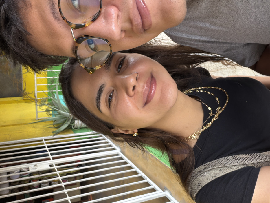 Two individuals are closely positioned in a selfie. The person in the foreground is a brunette woman with a nose ring, wearing gold necklaces and a black top. Behind her is another individual with short dark hair and glasses, wearing a gray shirt. They are positioned indoors, possibly in a shop. The background features elements like a white metal rack and colorful walls, along with potted plants.