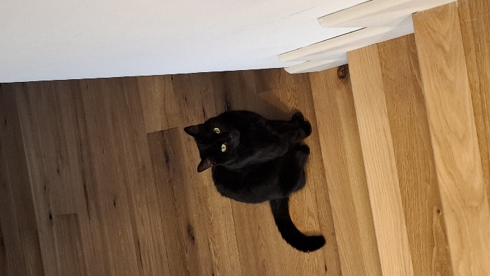 The scene is located in Elvange, Luxembourg, within an indoor residential environment. A black domestic short-haired cat with prominent yellow-green eyes is depicted sitting on light-toned wooden floorboards. The cat is oriented facing slightly towards the right but has its head turned to look directly towards the viewer. In the foreground, lighter wooden stair treads descend towards the right side of the frame. A plain white wall with a white baseboard and a portion of a white stair stringer or railing is visible along the right side. No people are present.