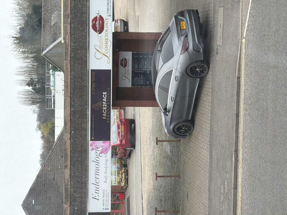 This image depicts a commercial street scene in South Holland, United Kingdom, under overcast daylight conditions. No individuals are visible. In the foreground, a paved road with a double yellow no-waiting line runs horizontally, separated by a kerb from a lighter-colored block pavement. Several reddish-brown metal bollards are placed along the edge of this pavement. A matte grey Mercedes-Benz CLA sedan, bearing UK registration plate AO63 GLZ, is parked diagonally on the block pavement, oriented towards the left. This vehicle features tinted windows and black multi-spoke alloy wheels. Behind the pavement and bollards is a gravel car park. A red Mazda 6 sedan, with UK registration plate LN67 YTS, is parked in the gravel lot, also facing towards the left. The front portion of another light-colored vehicle is partially visible on the far right of the car park. The car park is situated in front of a low-rise commercial building constructed with dark grey brickwork on its lower facade and a dark grey tiled roof. The building displays three prominent rectangular banner signs: 1. On the left, a white sign reads "Endermologie LPG Body Sculpting Studio" with contact number +48795 750 812 and social media handles. Below it, a smaller white sign reads "Zawsze blisko Always" with several product bags on a wooden pallet near an entrance. 2. In the center, a dark purple sign displays "FACE2FACE BEAUTY STUDIO" with contact number 07902 705783 and social media handles. 3. On the right, a white sign reads "Luxe Cosmetology" in gold script, featuring a red lip graphic with a syringe, and provides contact number 07889 598234 and social media handles. In front of the "Luxe Cosmetology" sign, a small brick-faced kiosk-like structure with a flat roof displays a "PRICE LIST" for Luxe Cosmetology. The background above the building's roof consists of bare trees, some green foliage, and indistinct distant structures.