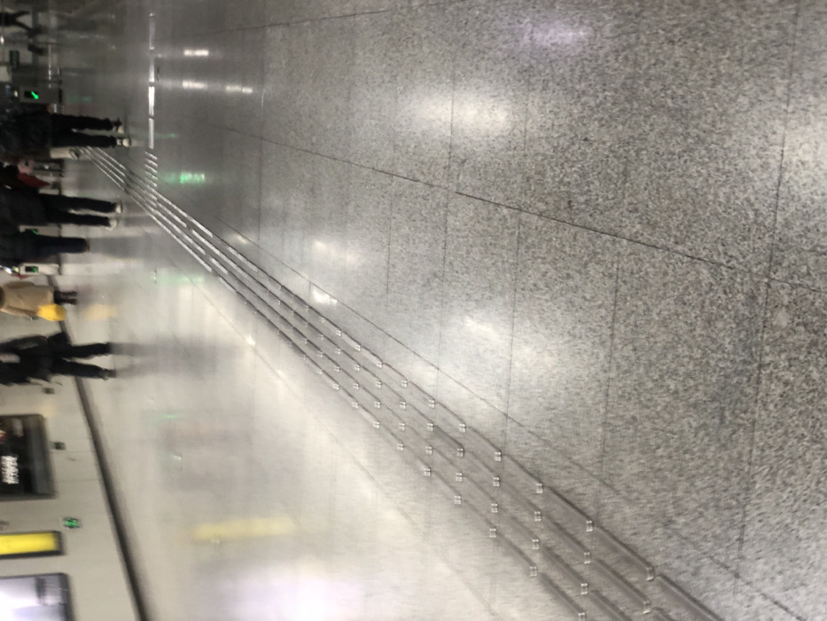 A brightly lit subway platform features a shiny, reflective floor. Multiple rows of metal lane dividers run parallel to the platform edge, creating distinct queuing lanes. Several people are standing in these lanes, waiting. The far wall is tiled with grey granite tiles. Reflections from overhead lights create bright patches on the floor and the wall.