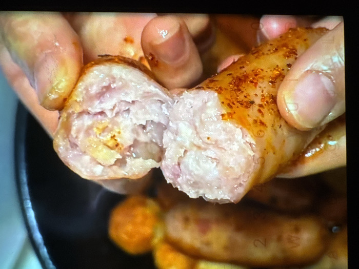 A sausage, split in half, is held between two fingers. The inside of the sausage appears pink and textured, with a small pocket of yellow. The outer casing is golden brown, speckled with red seasoning. Additional sausages and what appear to be potatoes are visible below, sitting in a black pan. The lighting is bright, showcasing the detail of the food.