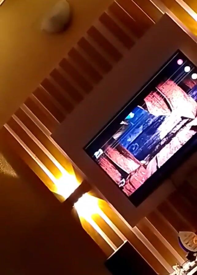 The camera looks up at a modern TV set mounted on a wall with a decorative light-wood frame
