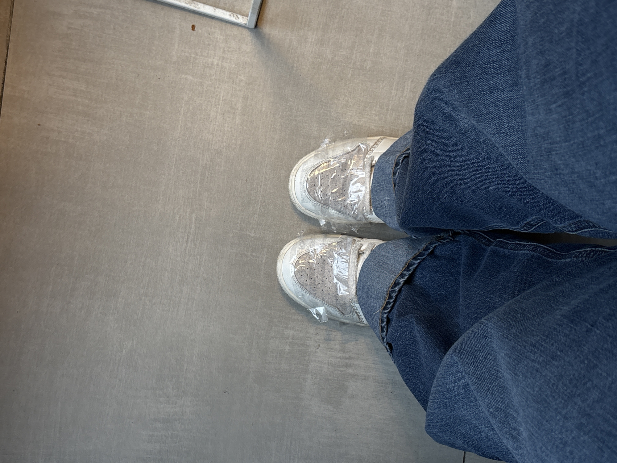 A person's lower legs and feet are depicted from a top-down perspective, standing on a uniform light grey floor. The individual wears blue denim jeans, which are folded and creased around the ankles. Both feet are clad in white athletic shoes, the forefoot area of each covered by a layer of crinkled, translucent plastic, consistent with disposable shoe covers. The floor surface exhibits minor, dispersed scuff marks. A thin, light-colored linear object, possibly a metal frame or trim, is partially visible at the upper right edge of the frame, casting a faint shadow. This scene occurs indoors, likely within a medical facility, clinic, or similar hygienic environment in Sofia, Bulgaria.