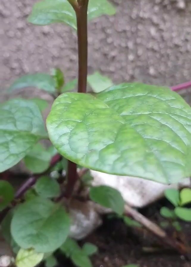 plant with green leaves and a reddish-purple stem growing against a rough, grey wall. The leaves have visible veins. There's also some smaller, ground-covering greenery and small stones visible in the soil at the base of the plant. The camera angle is low, close to the ground.