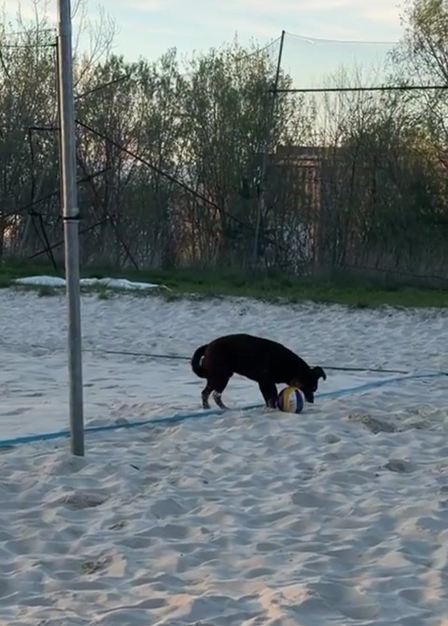 The scene is set on a sandy beach volleyball court. A dark-brown dog, presumably a labrador or similar breed, is sniffing and nudging a blue, yellow, and white volleyball. The dog walks around the ball on the sandy surface. A woman wearing black leggings and a black top enters the frame, walking towards the dog and the volleyball. The beach court is surrounded by sparse trees and a volleyball net is visible. A single pole supports the net. The sky above is light blue.