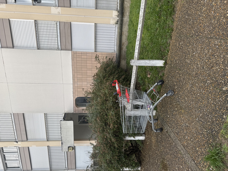 A neglected shopping cart leans against a concrete barrier near an overgrown bush, beside a building with closed window shutters. The building's facade consists of panels of white, beige and gray. The ground is a mixture of asphalt and grass. The image is slightly tilted and washed out.