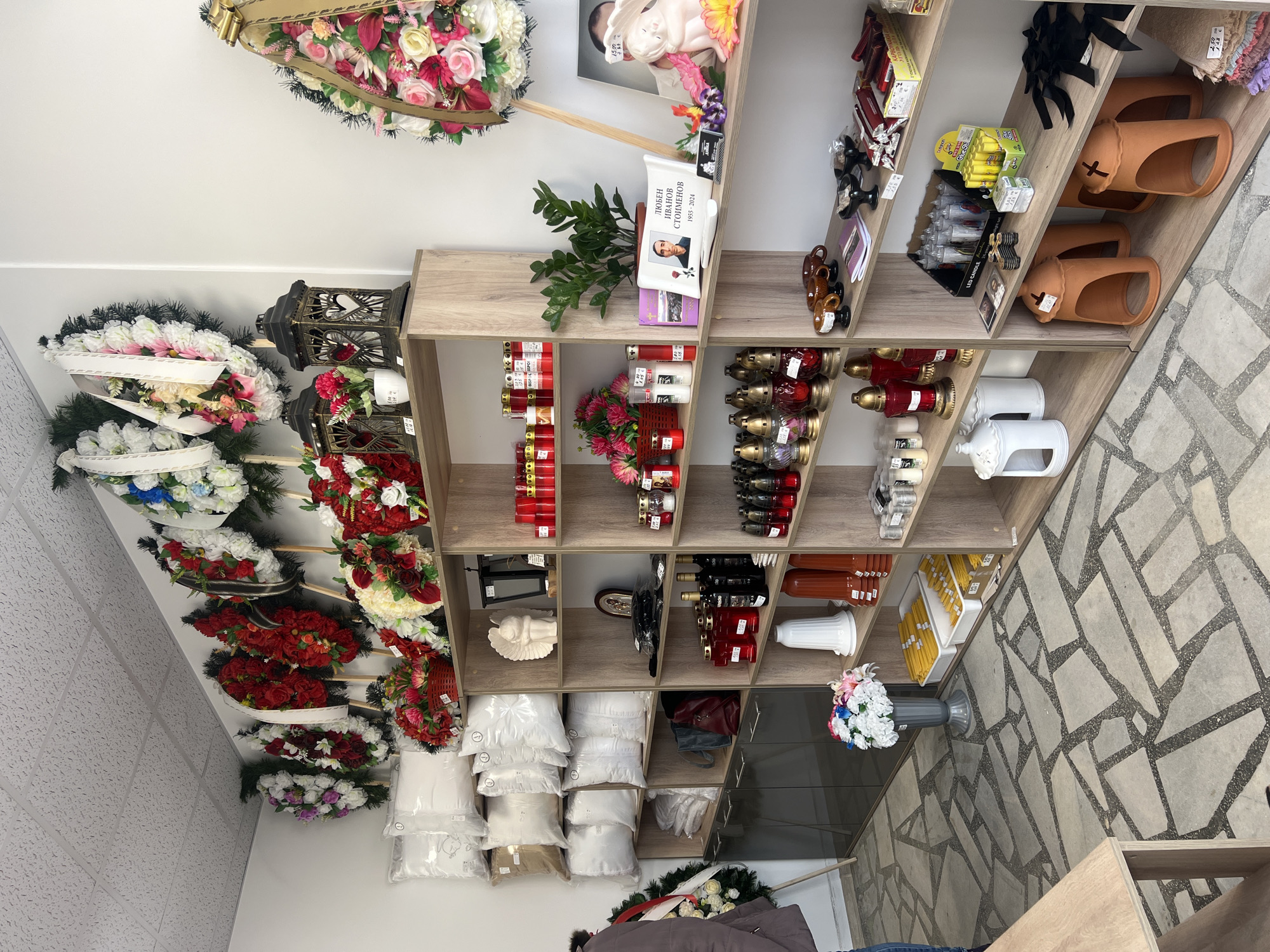 The image captures the interior of a funeral supplies shop in Gorna Oryahovitsa, Bulgaria. The scene is dominated by multiple light-wood colored open shelving units, meticulously stocked with various funeral and memorial items. On the upper walls and top shelves, numerous artificial flower wreaths are displayed, varying in shape and size, featuring combinations of red, white, pink, purple, blue, and gold flowers, some adorned with ribbons. Two ornate dark metal lanterns with heart-shaped cutouts are positioned on a top shelf. The shelves present a diverse inventory: * On the upper left, multiple individually wrapped white and beige pillows are stacked. * Throughout the shelving, a significant quantity of memorial candles is visible, including red glass, white, and clear glass types, alongside various decorative grave lanterns, many in red glass. * Central shelves feature a white rectangular plaque bearing a photo and the text "ЛЮБЕН ИВАНОВ СТОИМЕНОВ 1955-2024" (Lubomir Ivanov Stoimenov 1955-2024). * Other memorial items include small angel figurines, religious icons, artificial flower arrangements in baskets, bottles of liquid (possibly for rituals), small packaged goods, and black ribbons. * On the lower right shelves, terracotta-colored ceramic grave markers or covers with crosses on top are arranged. A single individual, partially visible on the far left of the frame, is dressed in a dark coat and blue jeans, standing on the floor. The floor itself is paved with an irregular mosaic-like pattern of light grey stone tiles set with dark grout. The ceiling is composed of white acoustical tiles. Dark grey reflective cabinets are visible beneath some shelves on the left side of the room.
