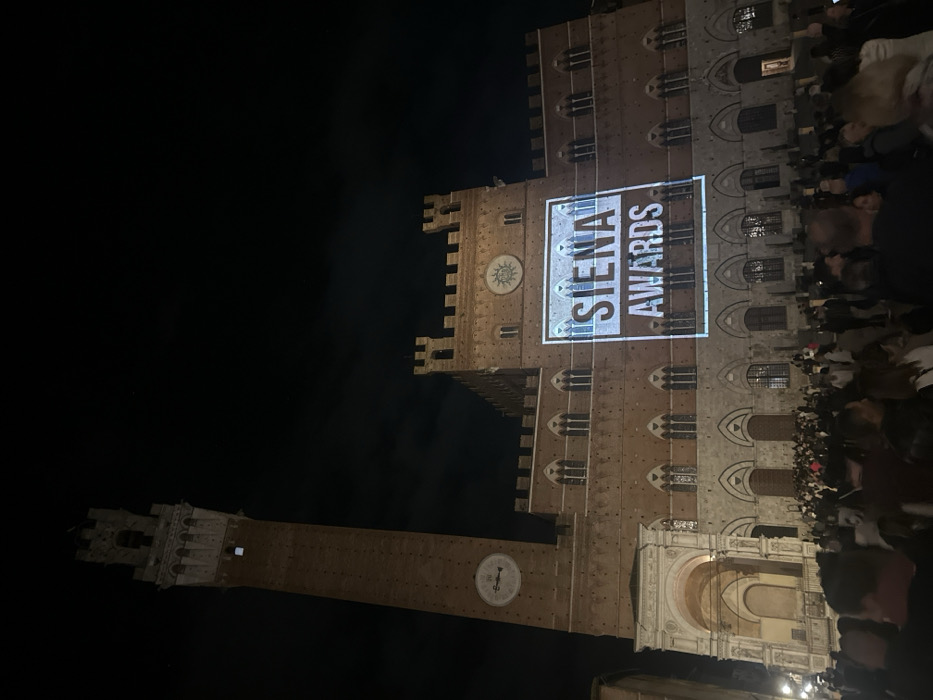 The image depicts a nighttime scene in the Piazza del Campo, Siena, Italy, featuring the Palazzo Pubblico and Torre del Mangia. A large, dense crowd of individuals is gathered in the foreground and midground, facing towards the historic buildings. The Palazzo Pubblico, a prominent brick and stone structure with a crenellated roofline, multiple arched windows, and a large clock face on its upper left, is illuminated by a projected image. This projection displays "SIENA AWARDS" in large white capital letters, framed by vertical architectural elements, across the central facade of the Palazzo. To the left of the Palazzo Pubblico, the tall, slender Torre del Mangia stands prominently, also constructed of brick, featuring a visible clock face lower on its structure and an ornate belfry at its peak. The sky above is dark, indicating night. The crowd appears to be observing the illuminated projection on the building.