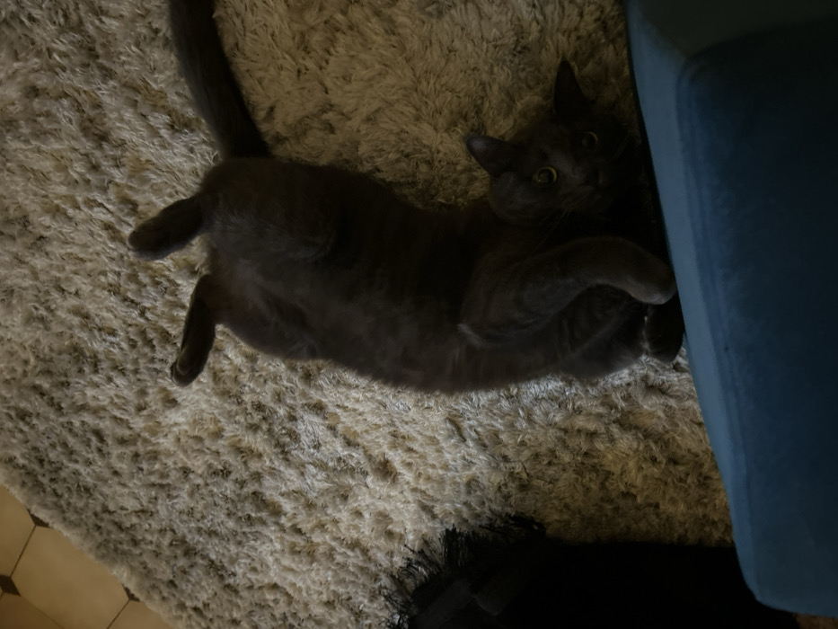 A gray cat lounges on a textured, light-colored rug. The cat is lying on its back, with its tail extending upward. One of its paws is curled towards its chest, while the other is extended outward. A portion of a blue cushioned object is visible on the right edge of the frame. The cat's eyes are open, and it appears to be gazing at the viewer. A black object is visible in the lower part of the frame.