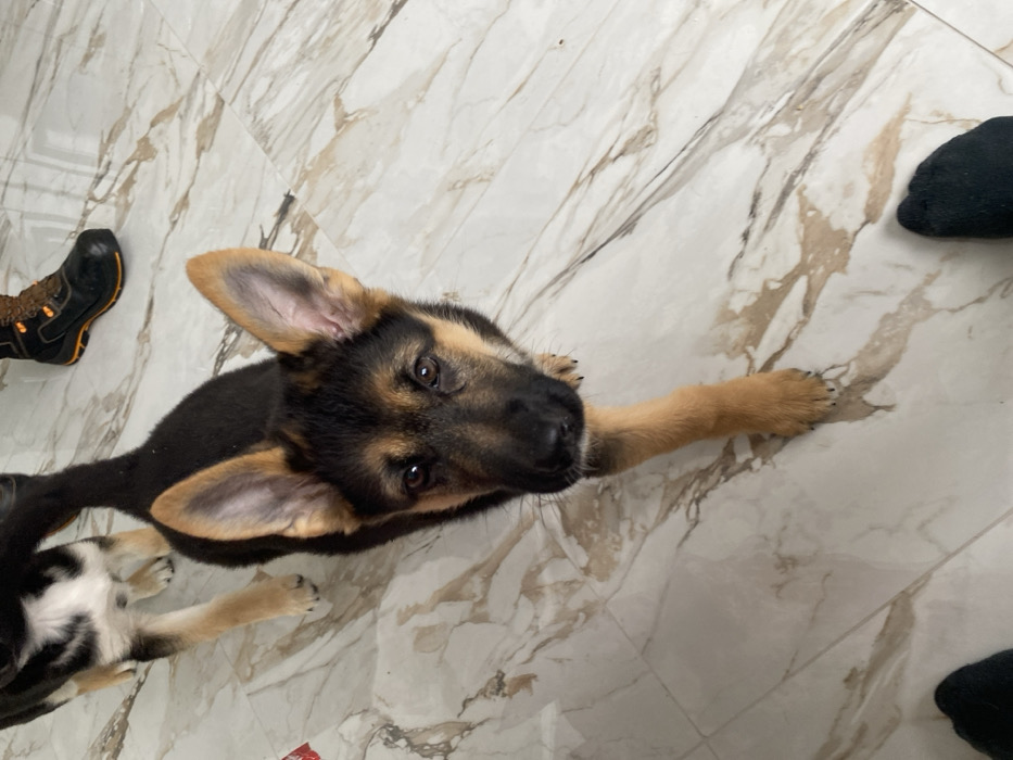 The image displays an indoor scene in Andreyevo, Russia, featuring two canines and elements indicating human presence, all situated on a light-colored, marble-patterned tiled floor. In the foreground and center, a young German Shepherd puppy, primarily black and tan with prominent upright ears, looks directly towards the viewer, its front right paw extended. Behind and to the left of the puppy, the hindquarters and partial rear legs of a second, larger German Shepherd are visible, exhibiting black and white markings. In the upper right portion of the frame, a human foot encased in a black and orange work boot is visible. A second human foot, covered by a dark sock, is partially visible in the bottom left corner.
