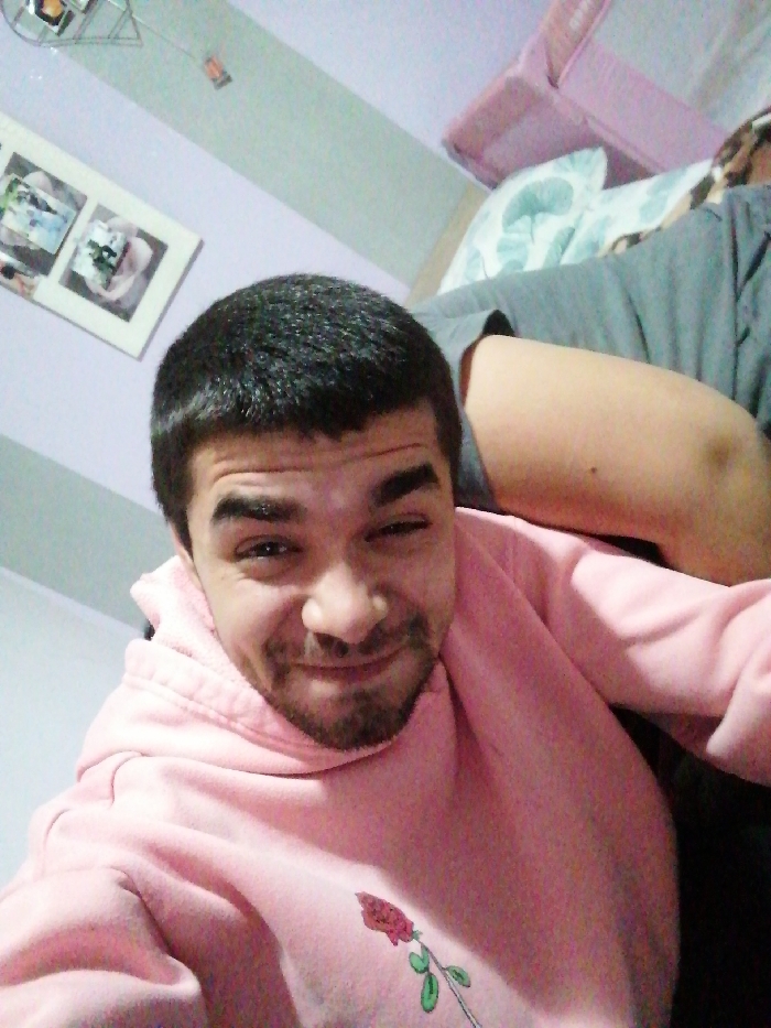 The image captures an indoor scene in Sredets, Bulgaria, centered on a male individual. This male, appearing to be in his mid-to-late twenties, possesses short dark hair, dark eyebrows, and a short beard or stubble. He is oriented towards the camera, displaying a slight smile and a wink with his left eye. He is wearing a light pink hooded sweatshirt adorned with a red rose embroidery on the left chest area, complete with a green stem and leaves. Behind and to the right of the primary subject, a partially visible human arm and what appears to be a knee or leg, clad in a grey garment, rests on an unseen surface. The background features a light purple wall with a white-framed picture display, containing indistinct photographic images. Above, a light-colored ceiling is visible, from which a small, geometric metal light fixture or decorative object is suspended. In the upper right background, a pink-colored object, consistent with a bed frame or furniture, is present alongside light-colored bedding featuring a teal pattern.
