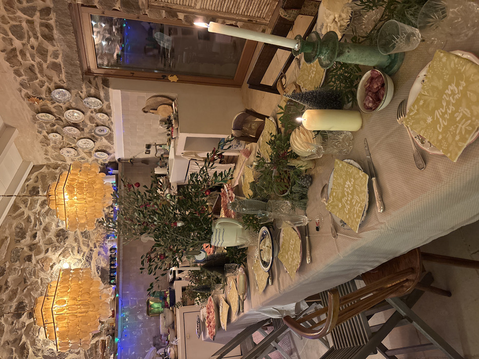 A dining table is set for a festive occasion. Candles and greenery decorate the table. Each place setting includes a plate, utensils, a napkin with a Christmas theme, and crystal glasses. A bowl of what appears to be a sausage or cured meat sits on one of the place settings. The room features stone walls and chandeliers. A kitchen is visible in the background.