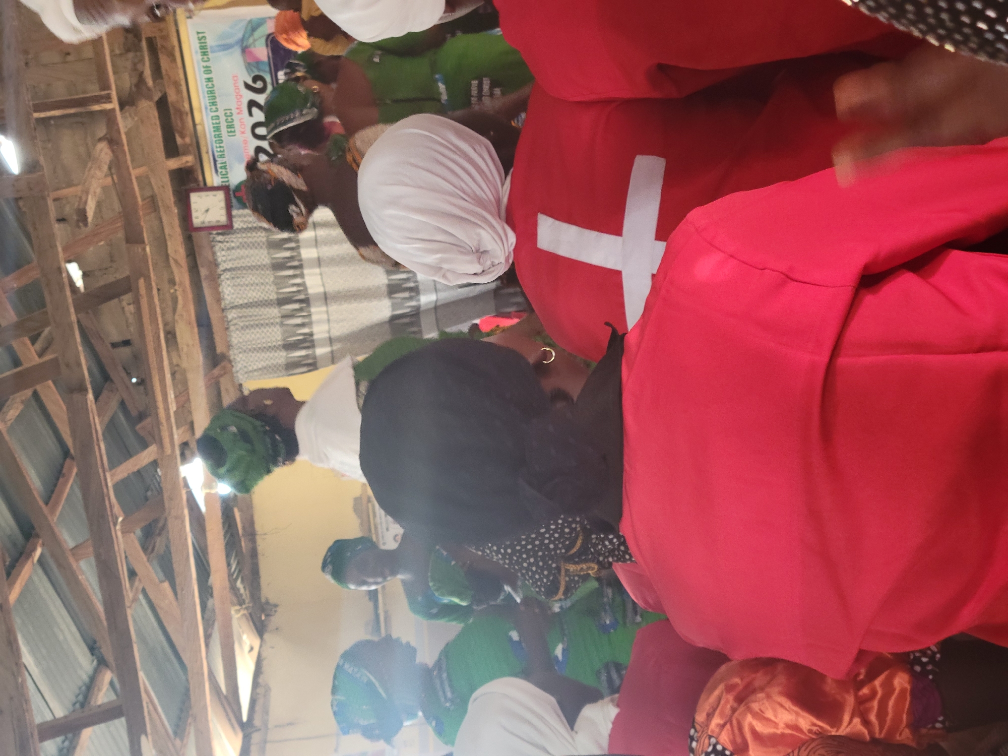 group of people inside a building, possibly a church, in Kwamba, Nigeria. The walls are unfinished and reveal exposed wooden beams. A clock hangs on the wall near a banner with text, partially visible, including "LICAL REFORMED CHURCH OF CHRIST" and "(ERCC) Kwamba, Kain. Magana." Individuals are wearing red shirts with white crosses and green garments with head coverings, indicating possible religious attire. Some are wearing white head coverings. The composition focuses on the people and the building's interior.