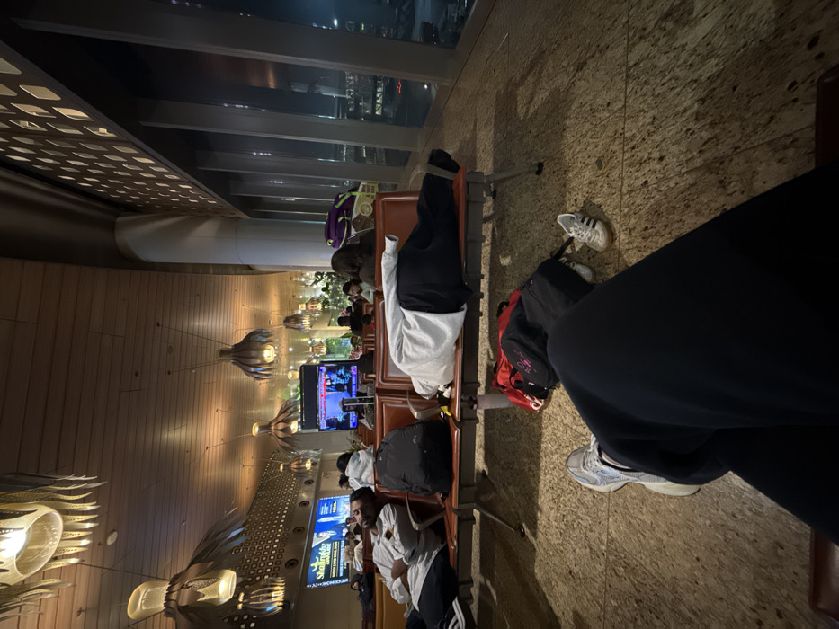 An airport waiting area is seen from a low angle. People relax on rows of chairs with personal belongings scattered around. Large windows offer a view of the city lights at night. Decorative light fixtures illuminate the space. A TV screen displays content for travelers. The person taking the picture sits on the chair and their legs and shoes are in the foreground.