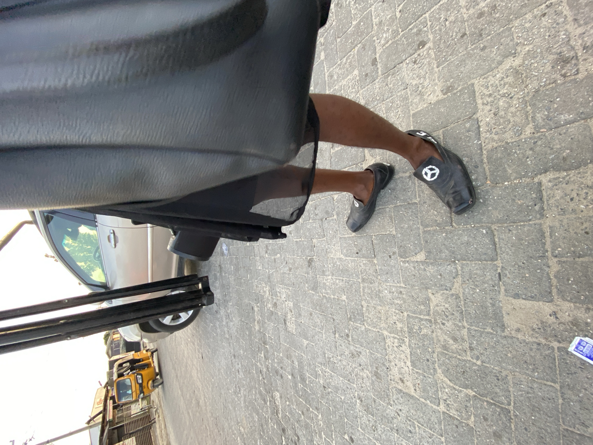 The photo captures a street scene in Ikorodu, Nigeria, observed from inside a vehicle. The lower legs and feet of a person wearing black short pants and black shoes are visible, extending out of the car. The car door is open. The pavement is composed of interlocking gray bricks. The exterior view reveals a yellow three-wheeled vehicle (keke napep) and surrounding buildings. A piece of blue and white litter lies on the pavement.