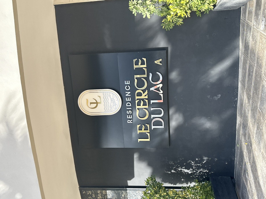 An outdoor, daytime, eye-level shot captures the facade of "Résidence Le Cercle du Lac" in Fez, Morocco. A prominent black rectangular sign is centered on a dark grey or black wall. At the top of the sign, an oval logo features a gold 'CL' monogram superimposed over stylized white waves. Below the logo, "RESIDENCE" is spelled in white capital letters. Beneath this, "LE CERCLE DU LAC" appears in large, three-dimensional capital letters, primarily gold-colored, with "DU LAC" exhibiting a slightly iridescent or patterned finish. To the left, a dark rectangular planter contains dense green foliage, casting a shadow onto the wall. To the right, another planter, likely dark grey, holds similar green plants. Sunlight illuminates the scene, creating distinct shadows from the foliage on the wall and an overhead structure on the ground. The ground is paved with square, light grey tiles. No individuals or animals are present.