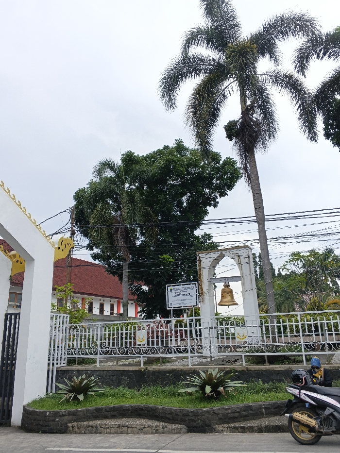 The image depicts an exterior view of a walled compound from an adjacent roadway in Ho Chi Minh City, Vietnam, under an overcast sky. In the foreground, a paved surface leads to a raised median adorned with dark stone curbing, green grass, and two agave-like succulent plants. A black and white scooter with gold-colored wheels and exhaust is parked on the right, facing left. A person, partially visible behind the scooter, wears a blue head covering and a yellow scarf, appearing to interact with the vehicle. The midground features a white ornamental metal fence with decorative scrollwork, separating the roadway from the compound. Behind the fence, a white, arched belfry structure houses a large, golden bell. To the left of the belfry, a white rectangular sign with black text is mounted. In the background, a white building with a distinctive red-tiled roof and multiple rectangular windows is visible. The compound entrance on the far left features a white archway adorned with yellow, wavy decorative elements. Numerous trees are present, including tall palm trees with visible fronds and dense green foliage trees, dominating the upper and central portions of the frame. Overhead, multiple black utility lines traverse the scene. No active interactions between individuals are discernible beyond the person with the scooter.