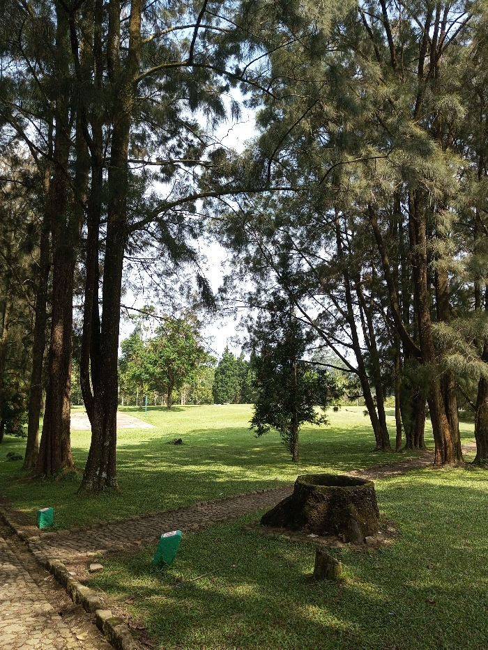 The image displays an outdoor park or wooded area in New Serchhip, India, under clear weather conditions. A paved pathway with a cobblestone pattern enters from the lower-left and curves into the midground. Two small, upright, light-green rectangular markers are embedded in the grass immediately adjacent to the pathway on the left. In the right foreground, a large, dark, moss-covered tree stump, hollowed at its center, rests on the grass, accompanied by a smaller stump near its base. The ground consists primarily of green grass, showing distinct areas of direct sunlight and dappled shade cast by surrounding trees. Numerous tall trees with slender, dark trunks and needle-like foliage line both sides of the pathway and frame an expansive, sunlit grassy field in the midground. Several smaller, bushier green trees are sparsely distributed within this field. A denser line of trees defines the background beyond the field. A bright, light-blue sky is visible through the tree canopy. No human figures, animals, or vehicles are present in the scene.