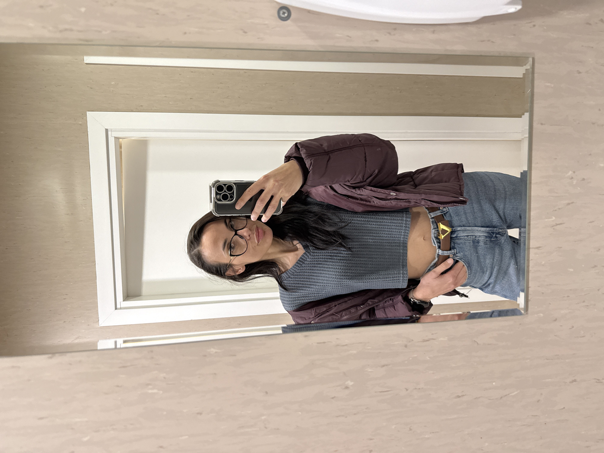 A woman in a gray top, blue jeans, and a maroon jacket is taking a selfie in a mirror