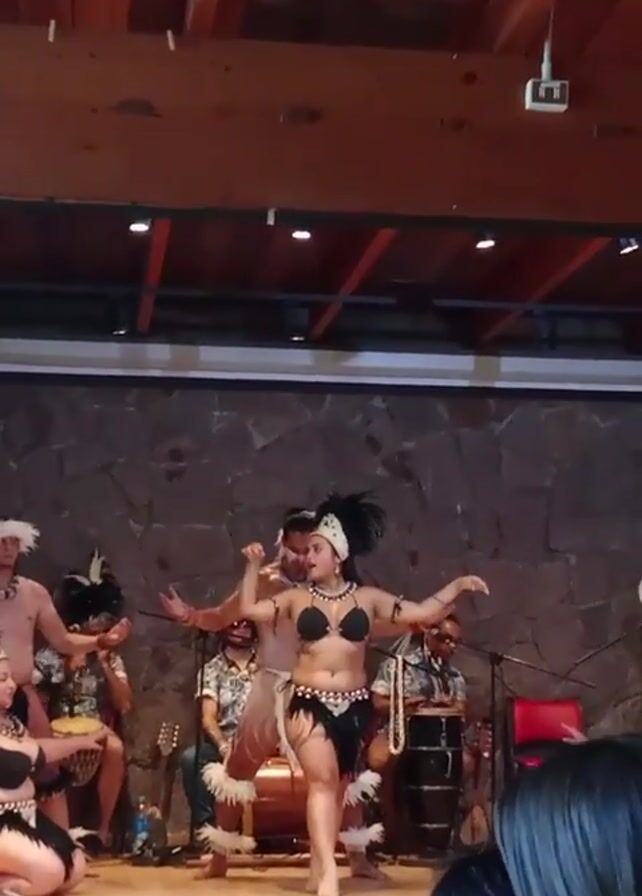 A female dancer is performing on a stage with a band. She is wearing a black bra and a black skirt with fringe. Her hair is up in a white headpiece with black feathers. Behind her, a man is standing with his arms outstretched. He is wearing a skirt and has white fringe around his legs. The band members are sitting behind them, playing various instruments, including drums, guitars, and an accordion. Some are wearing headpieces. The stage is made of wood and has a stone wall behind it. A crowd is watching the performance. The ceiling above has wood beams.