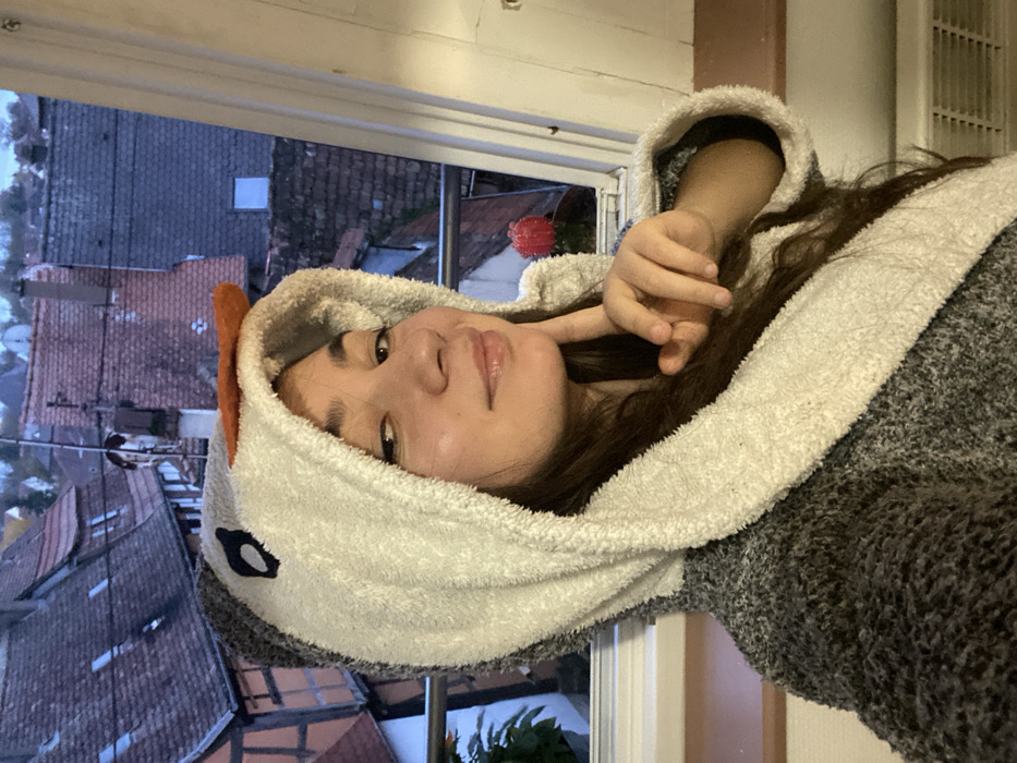 A female individual is depicted in a medium close-up, posing from an interior vantage point overlooking an urban landscape in Bouxwiller, France. She wears a grey and white plush robe featuring a hood designed to resemble a penguin, complete with embroidered black eyes and an orange fabric beak. Her long, dark hair is visible beneath the hood. The subject's right hand has its index finger resting against her chin/jawline, and she is smiling faintly while looking directly at the camera. The background, visible through a window, showcases a dense arrangement of traditional European buildings with terracotta-tiled roofs. Several structures exhibit half-timbered construction. A metal railing is visible just outside the window, and two potted plants – one with red foliage and another with green leaves – are positioned near the window frame. The sky above the buildings appears overcast or indicative of twilight conditions. Elements of the interior space include a light-colored wall or window frame to the right and a heating vent at the bottom right.