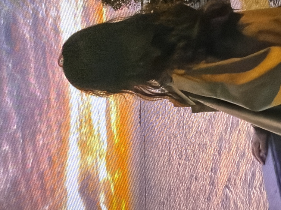 A single individual, viewed from the rear, is positioned on a vantage point overlooking a body of water at sunset in Lhokseumawe, Indonesia. The person possesses long, dark hair and is attired in a light-colored coat, possibly beige or khaki, over a yellow garment; a distinct vertical yellow stripe or lining is visible on the right sleeve of the coat. The individual's right hand rests upon a dark railing or ledge in the immediate foreground. The expansive body of water, presumably the sea, occupies the midground, reflecting the vivid hues of the sky. Distant landmasses are faintly discernible on the horizon line. The sky above is characterized by a dramatic sunset, featuring clouds intensely illuminated with orange and yellow light near the horizon, transitioning to shades of pink and purple in the upper atmosphere. The scene is significantly backlit, rendering the individual in partial silhouette. The image itself displays a prominent grid-like texture across its surface.