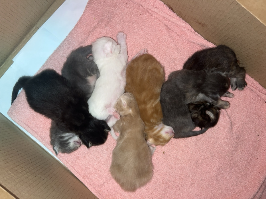 - "Eight small, short-haired felines, consistent with kittens, are depicted resting together within a brown cardboard box, the interior of which is lined with a folded, light pink terry cloth towel" by FM-Ke9ym1, licensed under CC BY 4.0