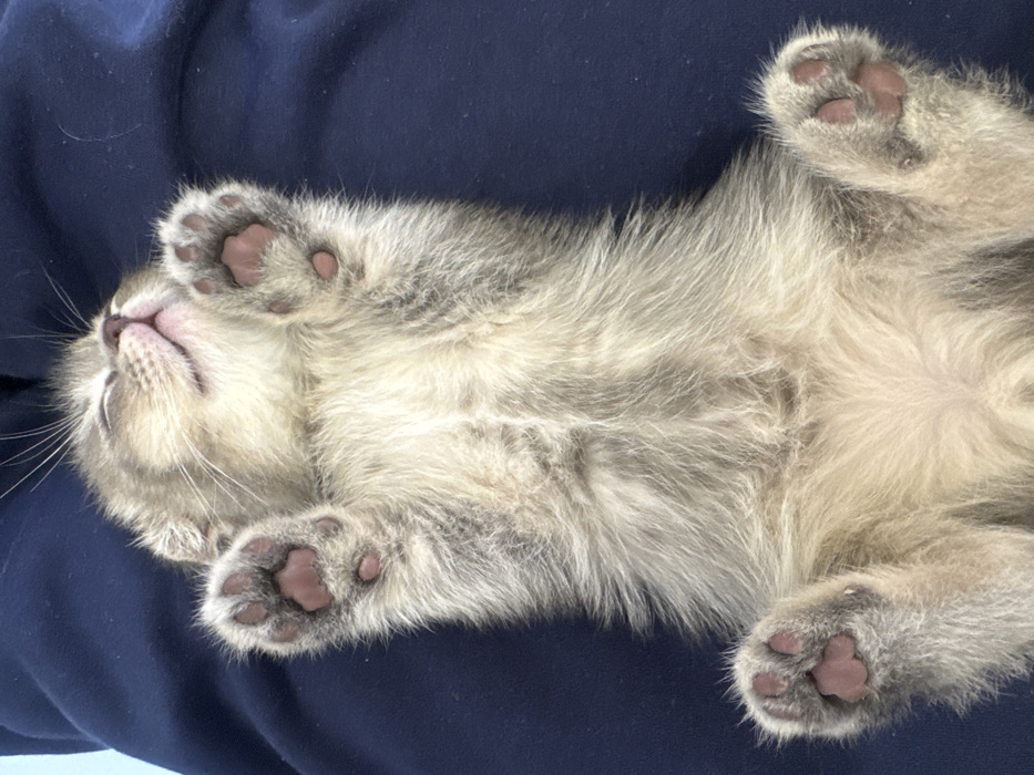 A light-colored tabby kitten is depicted lying on its back, centered in the frame. The kitten is asleep, with its eyes closed and mouth slightly open, revealing a pink nose. All four paws are extended upwards, displaying visible pink paw pads on each. Its fur is predominantly light grey with subtle darker tabby stripes, particularly evident on the head and limbs; the ventral fur appears lighter. The kitten is resting on a plain dark blue fabric surface which constitutes the background. The specific location within the city of Strasbourg, France, is not discernible from the visual information provided.