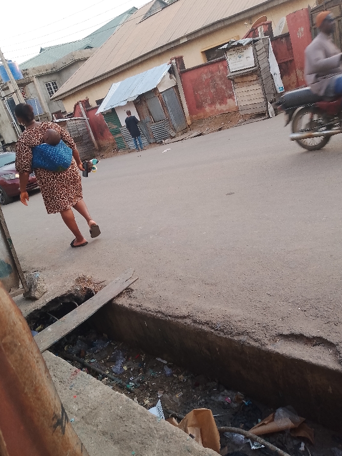 A woman in a leopard-print dress carries a child on her back as she walks along a street. In the background, a man stands in front of a corrugated metal building, and a motorcyclist rides by. In the foreground, a filthy open drain filled with trash is visible, partially covered by a plank of wood.
