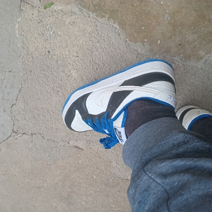 The image displays the lower legs and feet of an individual standing on a light grey, textured concrete surface in Duaca, Venezuela. The subject wears grey sweatpants with elasticated cuffs, dark grey socks, and athletic shoes. The shoes are primarily white and black, featuring white side panels and toe box, black overlays on the toe and heel, bright blue laces, a blue trim accent around the collar, and a blue outsole. A white Nike swoosh is visible on the side, and a white tag with blue "NIKE" text is visible on the tongue of the right shoe. The concrete ground exhibits minor cracks and variations in texture.