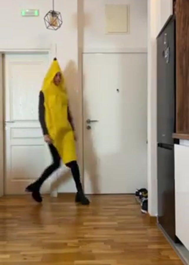 A young woman wearing a banana costume is posing and dancing in what appears to be a home environment