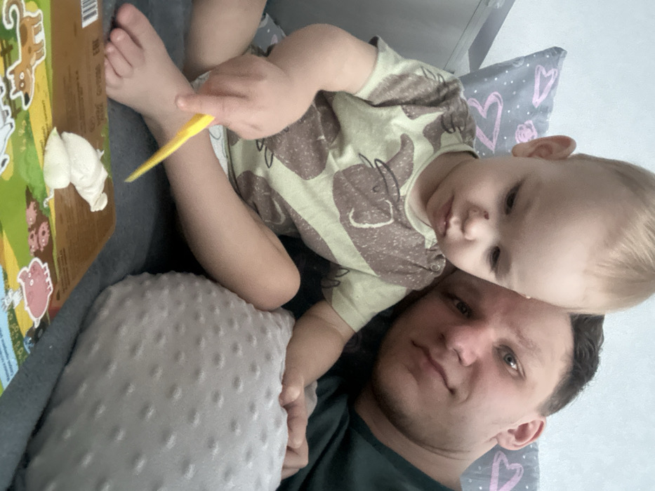 The image captures an indoor scene featuring two individuals: an adult male and a young child. The child, appearing to be a toddler, is positioned in the foreground, seated with legs crossed. They have light-colored hair and a dark mark is visible on the bridge of their nose. The child is wearing a short-sleeved t-shirt with a light green and brown abstract pattern and light-colored bottoms. They are focused downwards, holding a yellow plastic tool and actively manipulating a small amount of white, soft modeling material that rests on an open book or playmat. The book features colorful cartoon animal illustrations and visible Cyrillic text. The adult male is situated to the right of the child, with his head and upper torso visible. He has short dark hair and light-colored eyes, looking directly towards the camera. He is wearing a dark green short-sleeved shirt. Both individuals are resting on a dark grey upholstered surface, likely a bed or sofa. A light grey pillow with a textured, raised-dot pattern is visible beside the adult, and another grey pillow with pink heart and flower motifs is partially visible behind the child's head. The immediate background appears to be a plain light-colored wall or surface. The specific location within Perm, Russia, cannot be determined from the visual information provided in the image.