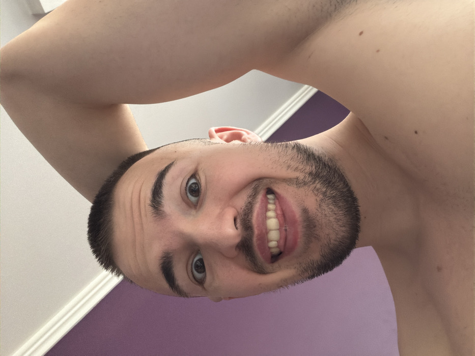 A close-up self-portrait captures a fair-skinned adult male indoors
