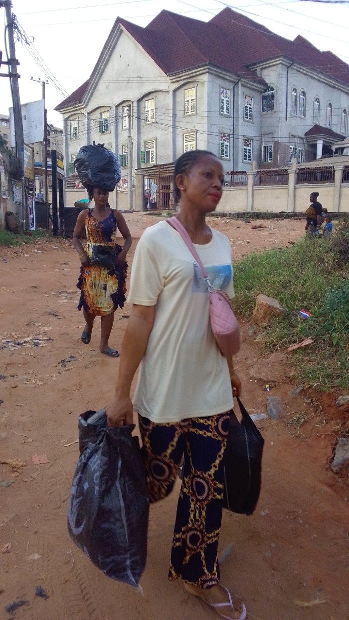 This image depicts an unpaved, reddish-brown dirt road in Obosi, Nigeria, at what appears to be late afternoon or early evening. In the foreground, an adult female with light brown skin, braided hair, wearing a light cream t-shirt with a faint graphic and dark blue wide-leg pants patterned with gold chains and rings, walks towards the viewer's right. She wears a pink quilted shoulder bag cross-body and light purple flip-flops. She carries two black plastic bags, one in each hand, at waist level. Her gaze is directed slightly to her right. Behind her, in the midground, another adult female with darker skin and dark hair walks in the same direction. She wears a sleeveless, multi-colored patterned dress with horizontal ruffles and grey flip-flops. She carries a large, dark-colored bundle, likely a black plastic bag, balanced on her head. A small black pouch is visible around her waist. The background is dominated by a large, multi-story building with a light grey, unpainted exterior and multiple gabled sections featuring dark reddish-brown shingled roofs. The building has numerous windows with white frames, some exhibiting decorative or stained glass-like patterns, and some with green shutters. A low concrete fence separates the building from the dirt road. To the far right background, beyond the fence and a patch of green grass with scattered rocks and litter, two adults and two small children are partially visible, appearing to be sitting or standing in an open area. One adult has a child strapped to their back. On the far left, a dark utility pole with overhead wires is visible, along with a partial view of another smaller building further down the road.