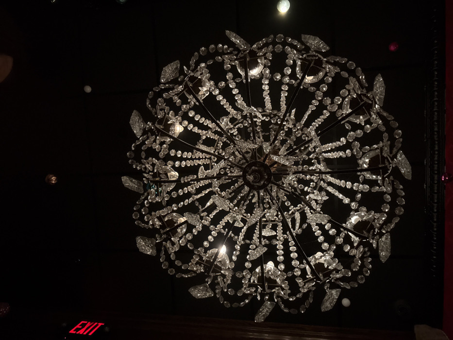 A large, ornate chandelier dominates the scene, suspended against a dark background. The chandelier is primarily composed of numerous clear crystals, arranged in a radial pattern. The crystals reflect light, creating a bright, sparkling effect. An "EXIT" sign is visible in the lower left corner, illuminated in red. The chandelier is the focal point, with the rest of the scene obscured by darkness.