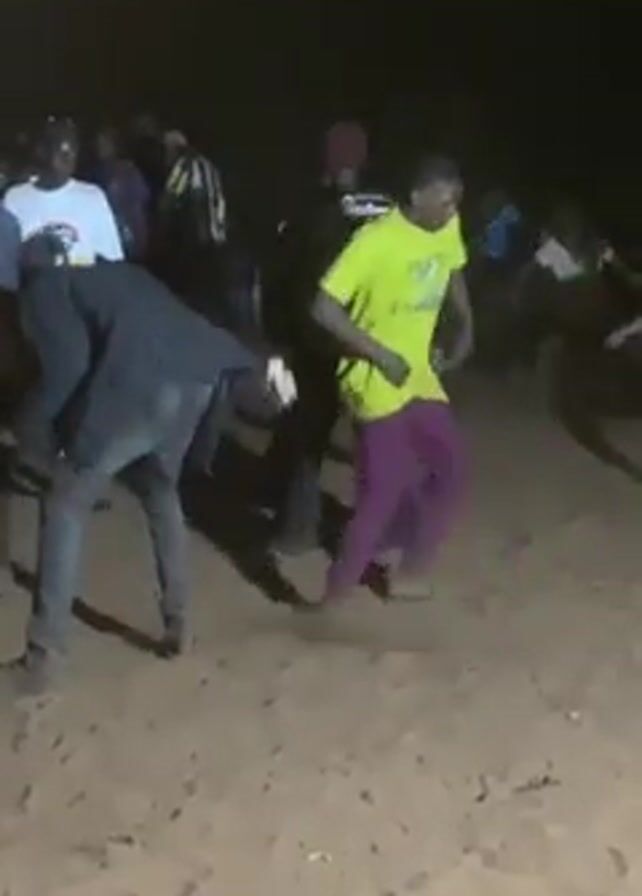 group of people dancing on a sandy surface at night. The area is dimly lit. Several people are visible, wearing various clothing styles. One individual stands out in a bright yellow shirt and purple pants, actively dancing. Another person is wearing a white shirt with a cartoon design. The group seems to be enjoying themselves, moving to music that is audible in the background. The surface they are on appears to be sand, suggesting an outdoor setting, possibly a beach or a sandy field.
