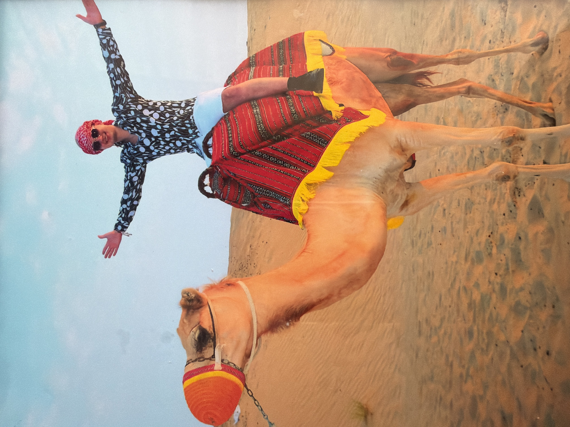 - "A person in a patterned shirt, white shorts, black boot, and red head covering is balanced on the back of a camel adorned with a colorful blanket and headpiece" by FM-Kueba2, licensed under CC BY 4.0