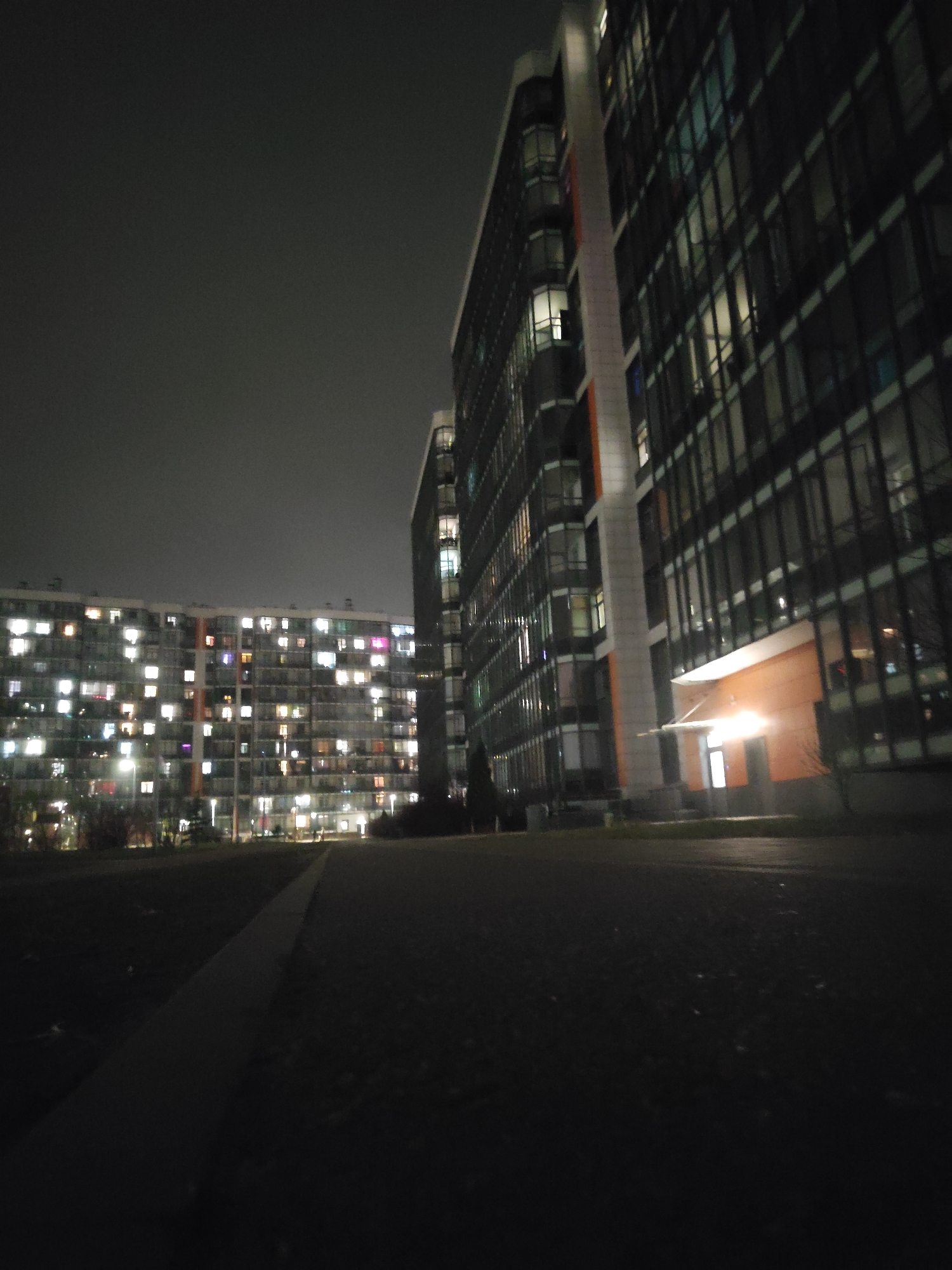 At night, a low-angle shot depicts a cityscape. In the foreground, a dark, paved surface stretches out, with a raised concrete curb separating it from what appears to be a grassy area on the left. To the right, the same surface extends, dimly lit. Two prominent buildings dominate the background. The closer building, situated on the right side of the frame, is a tall, modern structure with many windows reflecting interior lights. It has a geometric facade with alternating dark and light sections. Adjacent to it, a taller building recedes into the background. To the left, a more distant building is visible, characterized by numerous illuminated windows, suggesting a residential complex. The lights create a grid-like pattern, contrasting with the darker, more structured facade of the buildings on the right. Above the buildings, the night sky is overcast, creating a uniform dark background. The overall impression is one of an urban setting, potentially a residential area, at night.