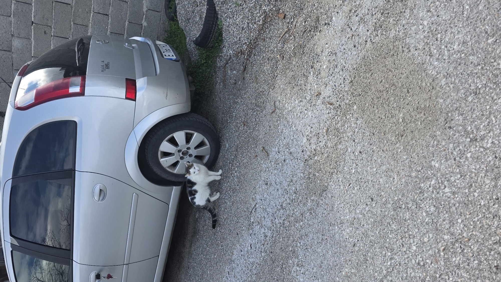 The scene depicts an outdoor environment in Jeleznitsa, Bulgaria, featuring a silver Opel Meriva compact MPV parked on a gravel surface. A domestic cat, predominantly white with black and brown/ginger markings, stands on the gravel adjacent to the vehicle's front passenger-side wheel, facing towards the viewer. The cat has a black-and-white patterned tail and light-colored eyes. The Opel Meriva is a five-door model, with the rear portion of the driver's side visible. Keys with a red heart-shaped keychain are inserted into the driver's side door lock. The rear windows of the vehicle are tinted. The car's rear bumper is visible, displaying a Bulgarian license plate "E 7661 HO". The vehicle is parked alongside a light gray, coarse concrete block wall. To the right of the car's rear, a patch of green vegetation is visible, along with a discarded, dark-colored tire resting on the ground. The gravel surface extends into the foreground, showing scattered small stones and debris. Reflections in the car's windows indicate an overcast sky with visible bare tree branches.