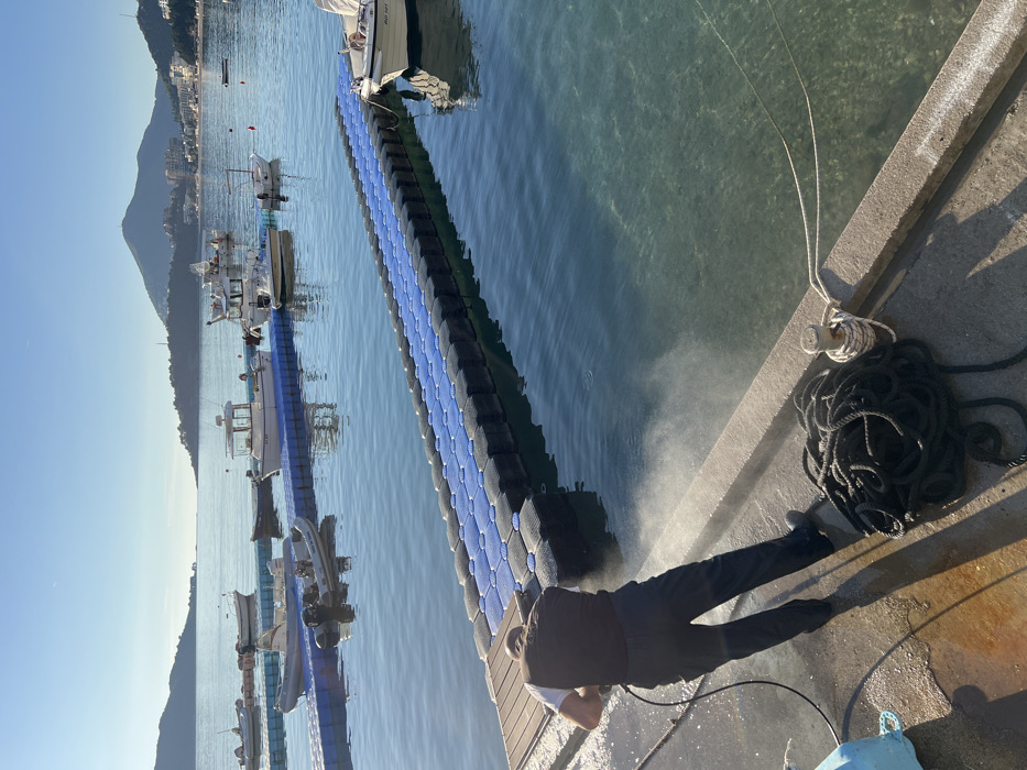 The image presents a daytime scene at a marina located in Budva, Montenegro. In the foreground, an adult male, viewed from behind, wears a dark vest over a light shirt and dark trousers. He is operating a pressure washer, directing a forceful stream of water and resulting mist onto the concrete edge of a pier. A substantial coil of dark rope rests on the pier's surface to his right, adjacent to a metal cleat from which a lighter rope extends into the water. A segment of wooden decking is visible on the pier to the left of the individual. Extending from the concrete pier into the calm, clear blue-green water is a long, modular floating dock constructed from alternating blue and black hexagonal plastic pontoons. Numerous boats are moored to these floating docks and anchored further out in the bay. These include multiple white fiberglass motorboats of varying sizes, one inflatable boat equipped with twin outboard motors, and a smaller traditional fishing vessel. The registration number "BD 121" is partially visible on the bow of a white boat in the midground, indicating a Budva registration. The background features a panoramic view of the coastline, characterized by distant forested hills and mountains, with urban development and structures lining the shore. The sky is clear and bright blue.